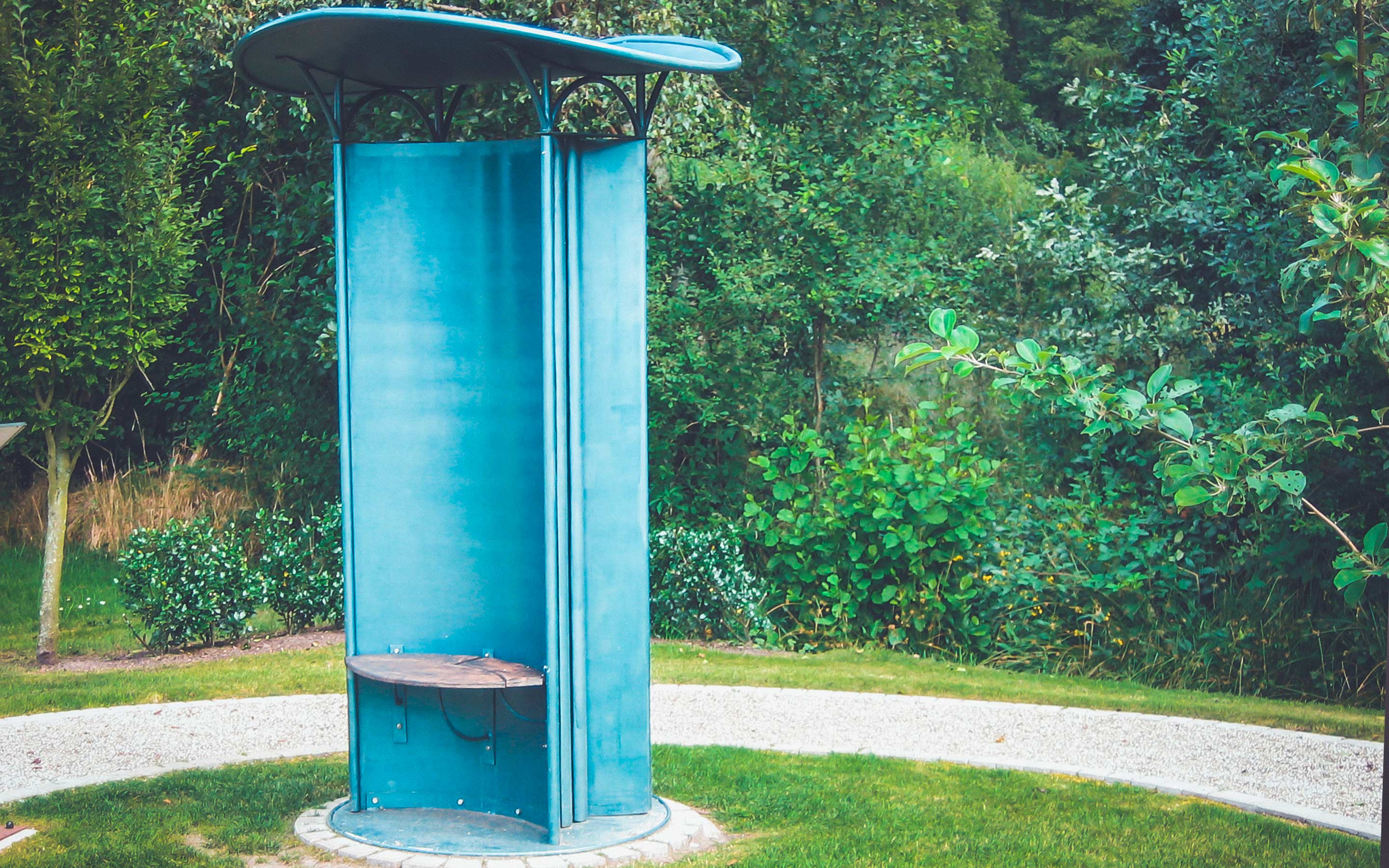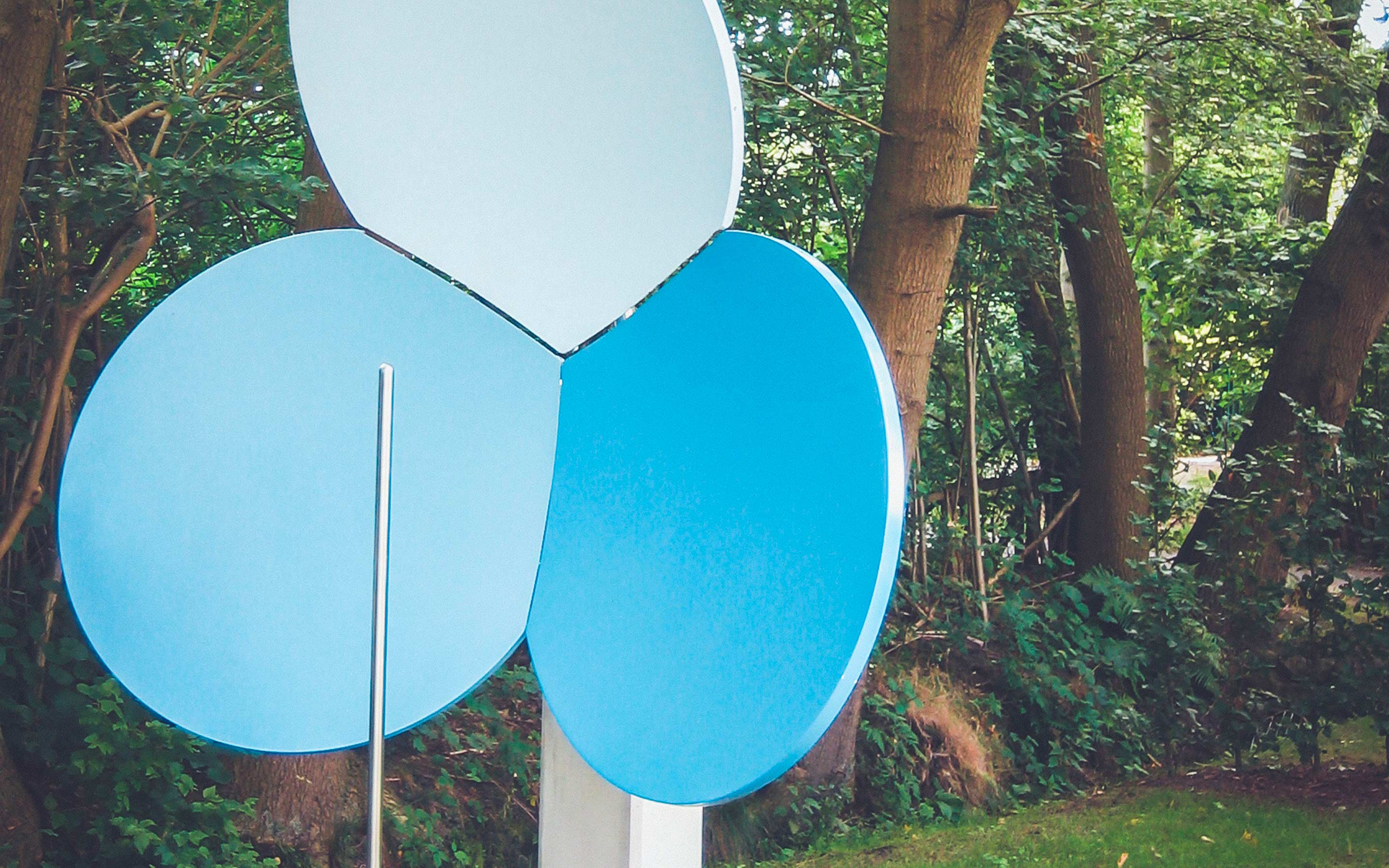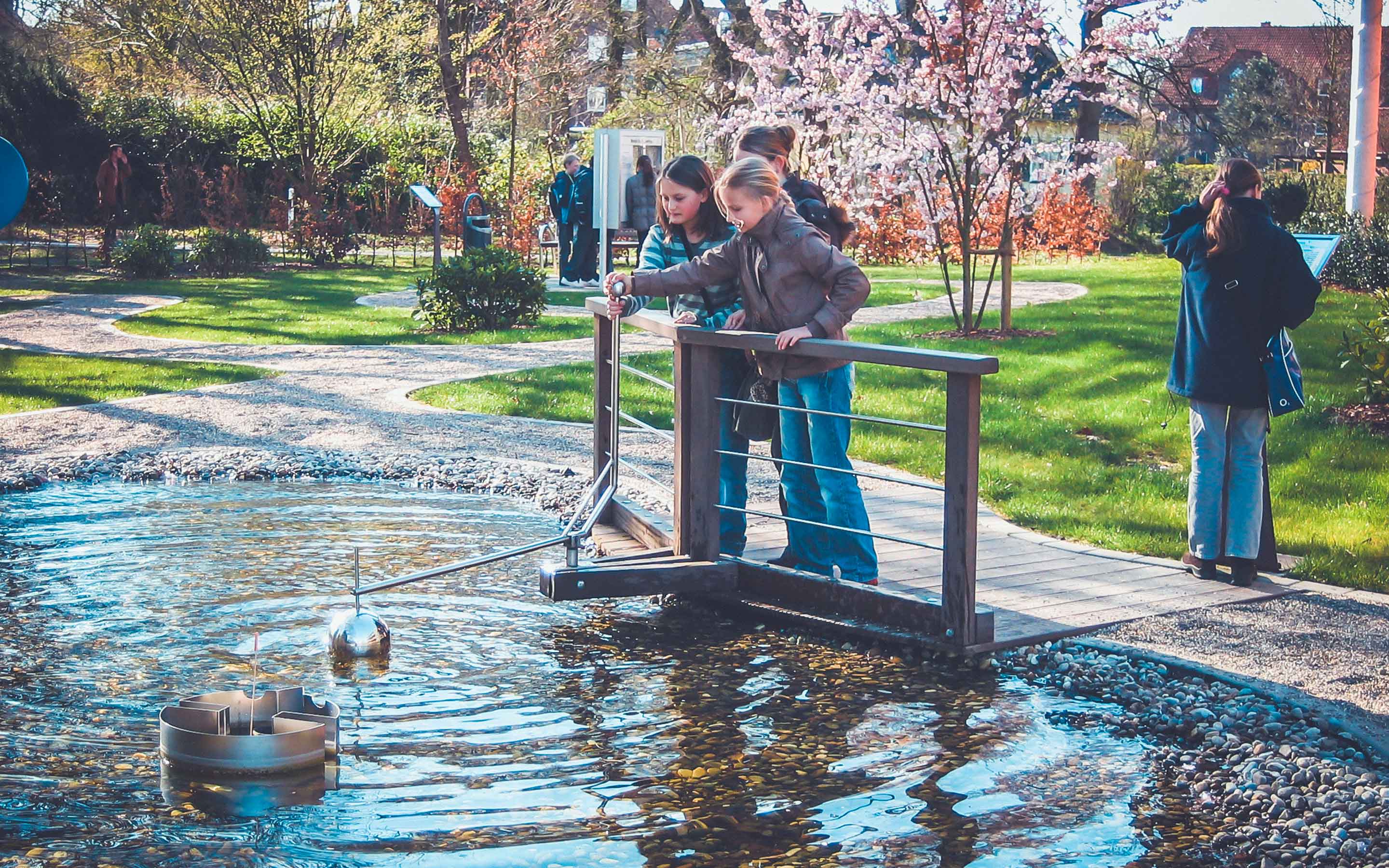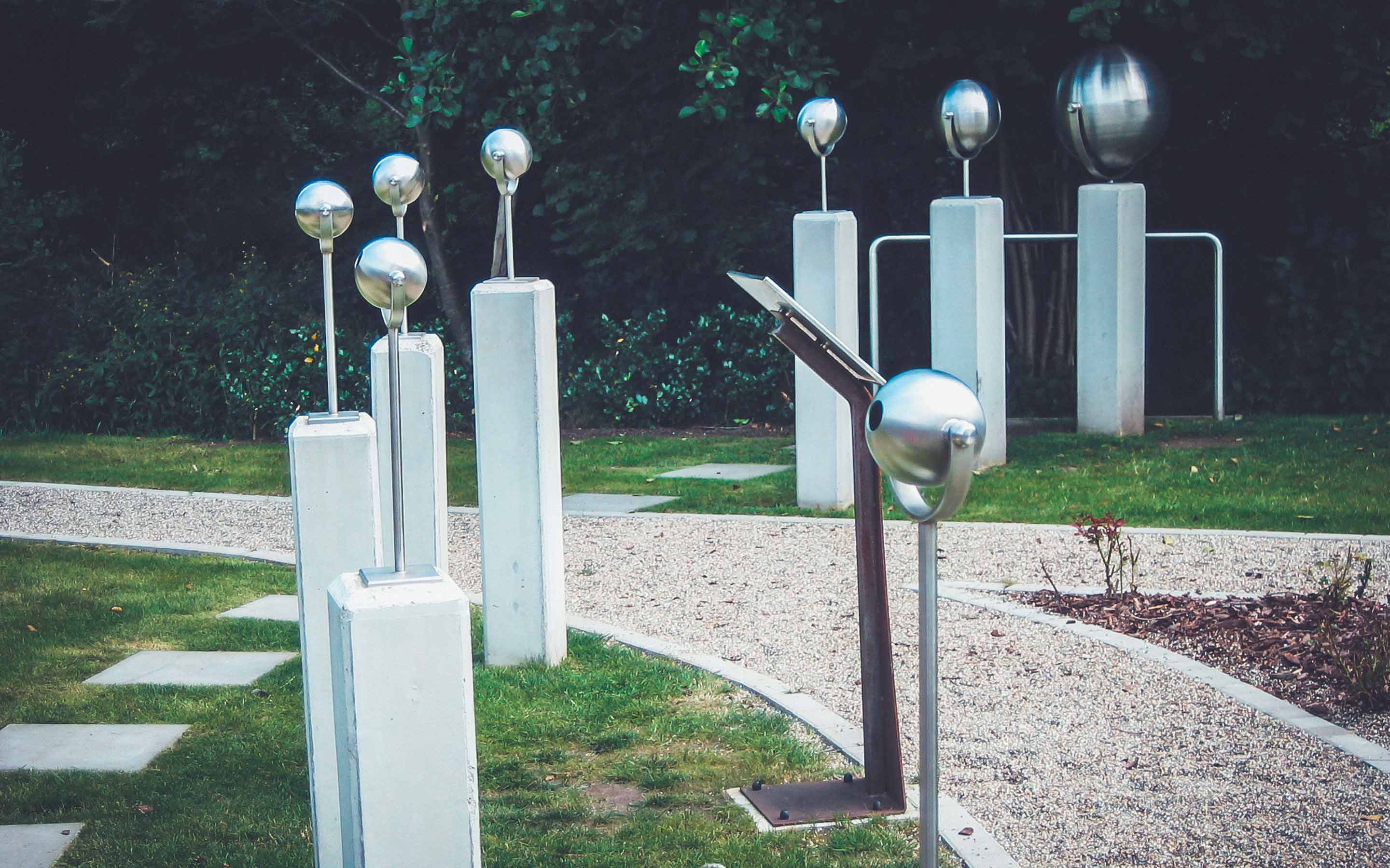 Dieser Teich veranschaulicht die enorme Fähigkeit unseres binauralen (zweiohrigen) Hörens bei der Ortung und Identifizierung von akustischen Objekten im Raum. Schall breitet sich in der Luft aus wie Wellen auf einem Teich. Unser Gehirn kann aus den Wellen des Schallfeldes genau die Position und die Art der Objekte heraustrennen. Dabei hat das Gehirn nur die Wellenbewegung am Ende der beiden Gehörgänge zur Verfügung – genau wie die Wasserbewegung in dem stilisierten Kopf im binauralen Teich.