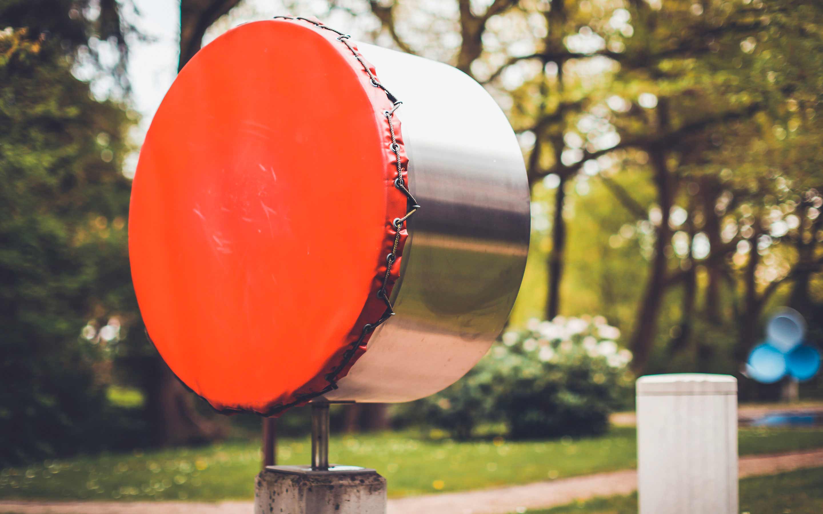 Mit dieser Pauke wird die Übertragung des Schalls vom Außenohr mit dem großen Trommelfell zum kleineren Eingang des Innenohrs durch die Mechanik des Mittelohrs veranschaulicht. Der Druckimpuls, der entsteht, wenn man auf die größere Seite draufschlägt ist so groß, dass die Übertragung der Kraft von der großen auf die kleine Fläche noch in einigen Metern Entfernung spürbar ist.