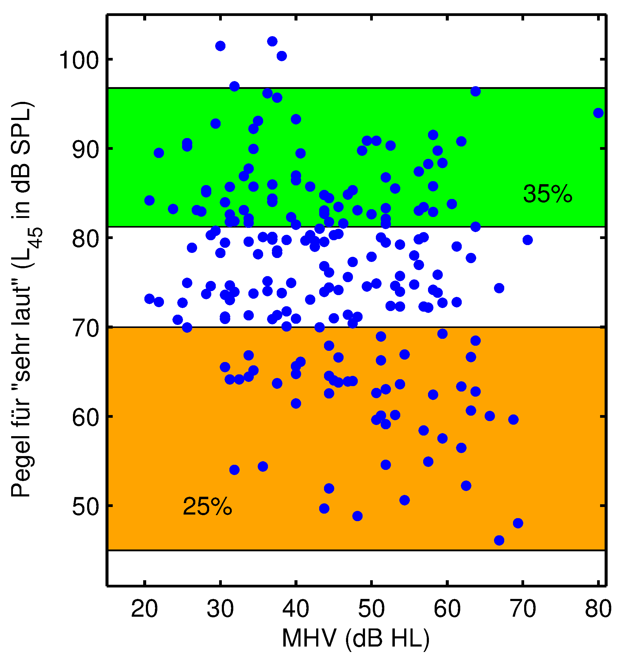 Abb. 4: Eingangspegel für eine „sehr laute“ Bewertung aufgetragen über dem mittleren Hörverlust. Der grüne Bereich zeigt den Bereich, in dem 80% der Normalhörenden den Pegel als „sehr laut“ bewerten. Der orange Bereich markiert die Kunden, die schon bei Eingangspegeln unter 70 dB das Signal mit „sehr laut“ bewerten.