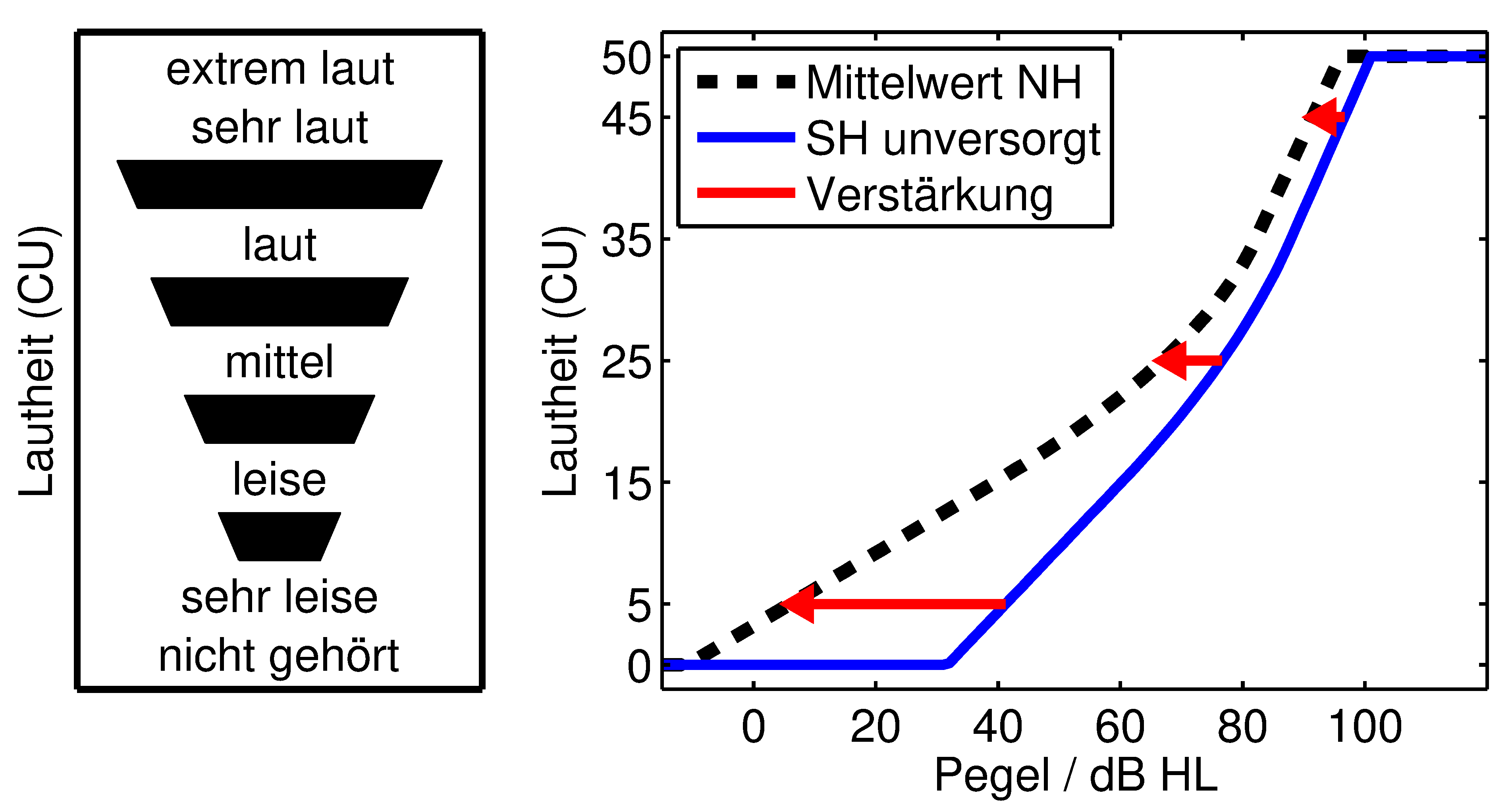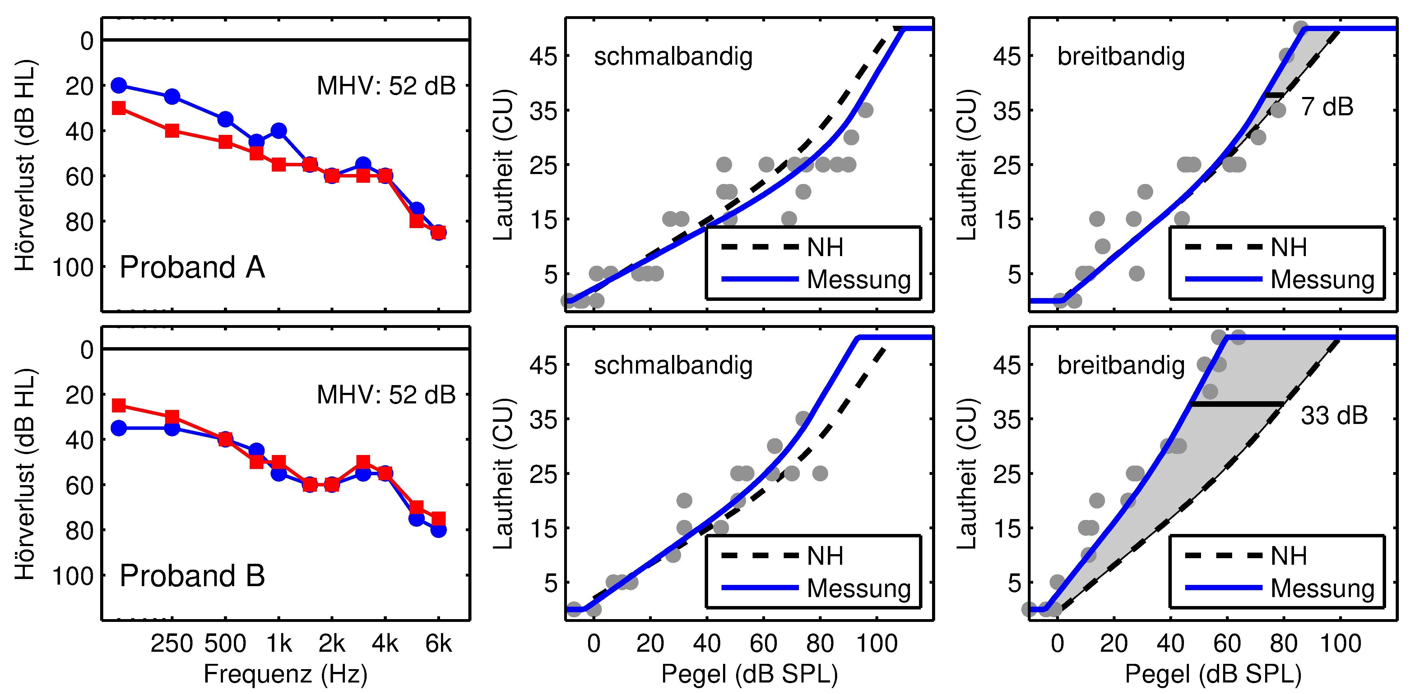Zwei Probanden mit ähnlichen Audiogrammen zeigen nach schmalbandigem Lautheitsausgleich normale Lautheitskurven für ein schmalbandiges Signal (Abb. 3, Mitte). Der Pegel der x-Achse entspricht dem Eingangspegel vor der Verstärkung durch schmalbandigen Lautheitsausgleich. Das entspricht dem Signalpegel für ein Signal, bevor es durch das simulierte Hörgerät verarbeitet und verstärkt wird. Jedoch zeigen sich große Unterschiede in der Lautheitskurve für binaural breitbandige Signale (rechte Abbildungen). Bei Proband A sieht man eine Lautheitskurve, die sehr dicht an der Lautheitskurve von Normalhörenden liegt, wohingegen Proband B schon bei geringen Pegeln eine stark erhöhte Lautheitskurve nach schmalbandigem Lautheitsausgleich zeigt. Bei einem Eingangspegel von 60 dB erreicht Proband B bereits eine Bewertung von "extrem laut". Der graue Bereich in Abb. 3 zwischen der binauralen breitbandigen Lautheitskurve nach schmalbandigem Lautheitsausgleich und der binaural breitbandigen mittleren Normalhörenden-Lautheitskurve wird als binaurale breitbandige Lautheitssummation bezeichnet. Die Werte für die erhöhte Lautheitssummation bei 80 dB Eingangspegel sind angegeben und betragen 7 dB für Proband A und 33 dB für Proband B.