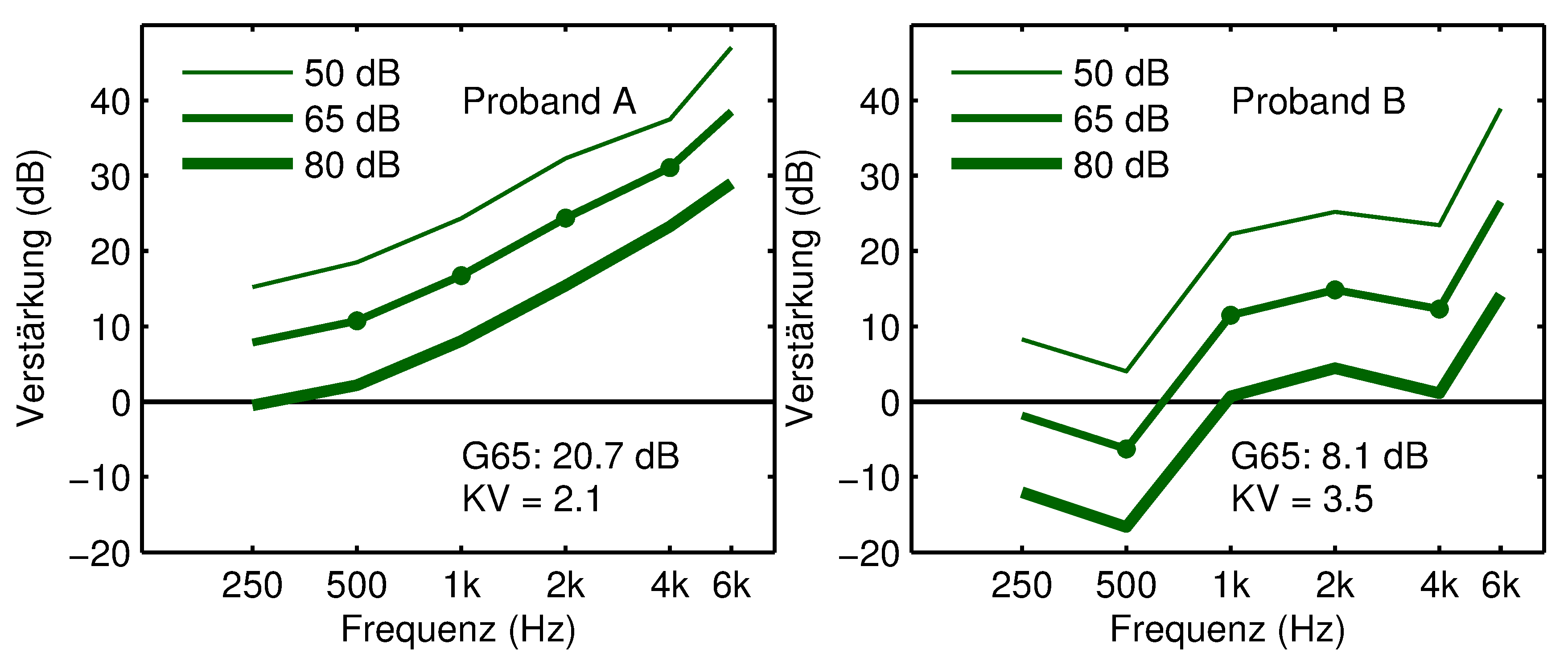 Das Anpasskonzept trueLOUDNESS [10,11] berechnet auf Grund der binauralen breitbandigen Lautheitskurve nach schmalbandigem Lautheitsausgleich die benötigte Verstärkung. Ziel dabei ist es ein normales Lautheitsempfinden für binaurale breitbandige Signale zu erzielen. Für Probanden mit ähnlichen Audiogrammen können dabei sehr unterschiedliche Verstärkungswerte vorhergesagt werden. Für Proband A und B sind die Verstärkungsvorhersagen nach trueLOUDNESS in Abb. 5 gezeigt. Für Proband A beträgt die durchschnittliche Verstärkung für einen Eingangspegel von 65 dB bei den Frequenzen 500, 1k, 2k und 4k Hz etwa 21 dB. Für Proband B ergibt sich nach der binaural breitbandigen Korrektur eine durchschnittliche Verstärkung von 8 dB. Das sind 13 dB weniger als für Proband A. Keine audiogramm-basierte Berechnungsvorschrift würde diese Unterschiede vorhersagen. Die durchschnittliche Verstärkung nach NAL-NL2 für 65 dB Eingangspegel für Proband A liegt bei 16,4 dB und für Proband B bei 15,6 dB. Der Unterschied beträgt also weniger als 1 dB in der Verstärkungsvorhersage nach NAL-NL2. Die Werte liegen etwa in der Mitte der Verstärkungsvorhersagen durch trueLOUDNESS. trueLOUDNESS sagt also nicht pauschal mehr oder weniger Verstärkung als NAL-NL2 vorher, sondern in Abhängigkeit von der binauralen breitbandigen Lautheitssummation kann die Verstärkungsvorhersage höher, ähnlich oder niedriger im Vergleich zu NAL-NL2 ausfallen.