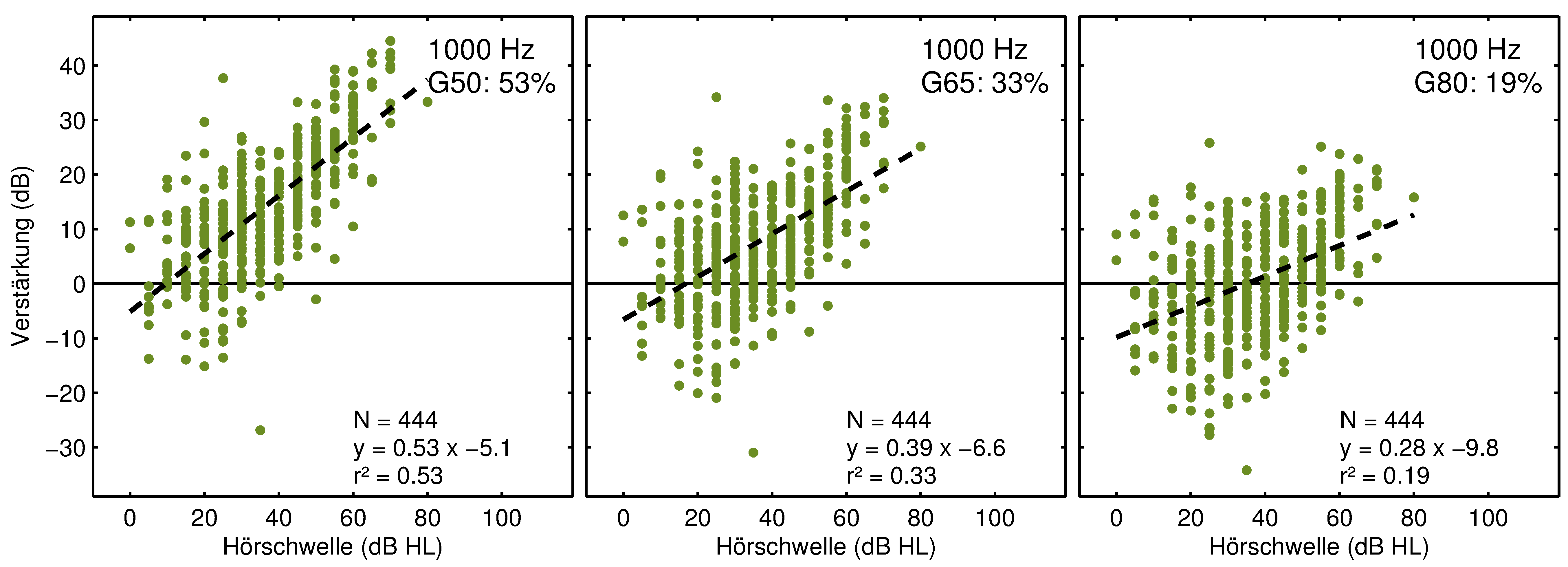 Da der Effekt der erhöhten Lautheitssummation mit dem Pegel ansteigt, ist die größte Unsicherheit in der Verstärkungsberechnung auf Grundlage der Hörschwelle für hohe Pegel zu erwarten. Der Zusammenhang zwischen der Hörschwelle und den vorhergesagten Verstärkungswerten bei 1 kHz nach trueLOUDNESS ist in Abb. 6 zu sehen. Man kann erkennen, dass mit zunehmender Hörschwelle die Verstärkungswerte ansteigen. Bei 50 dB Eingangspegel kann etwa 53% der Streuung innerhalb der Daten durch die Hörschwelle erklärt werden (linke Abbildung). Bei 65 dB sind es nur noch 35%. Bei 80 dB können nur noch ca. 21% der Streuung durch das Audiogramm erklärt werden.