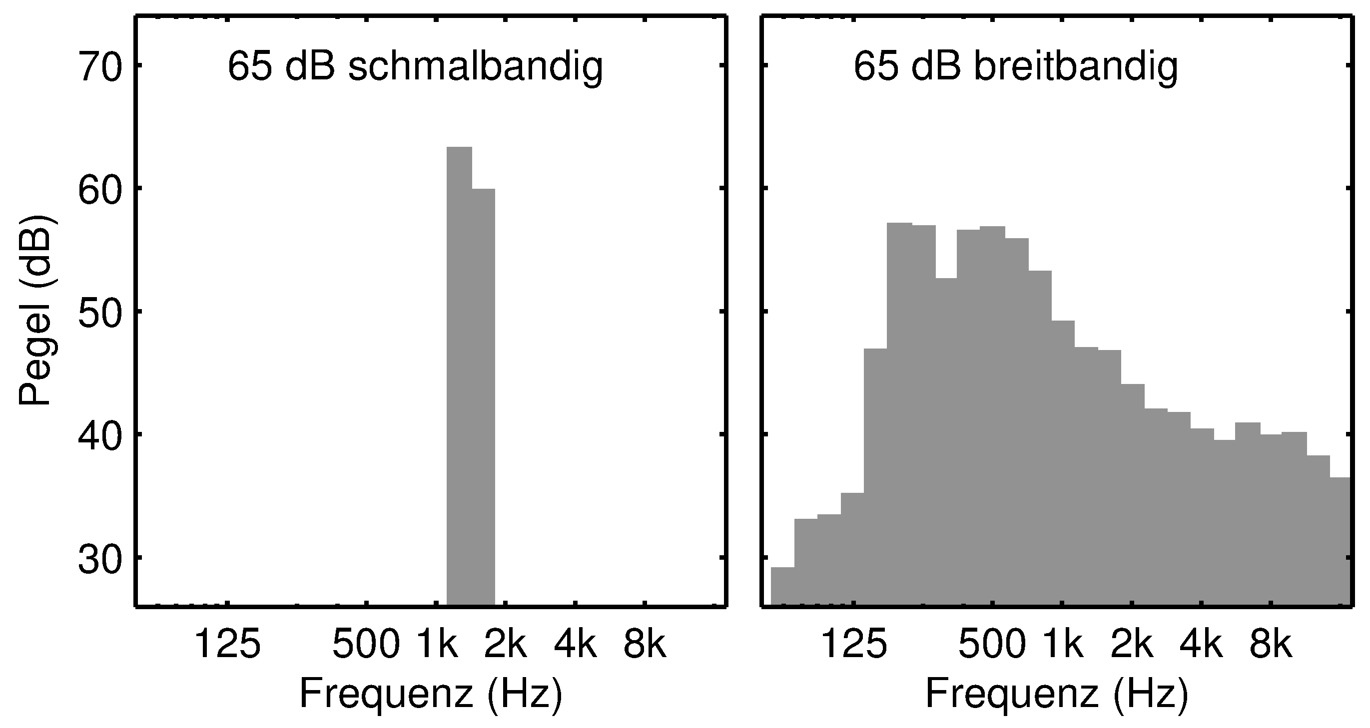 Betrachten wir Signale aus unserem Alltag, liegen überwiegend breitbandige Signale wie Sprache, Musik und Umgebungsgeräusche vor. Daher sollte das Ziel der Hörgeräteanpassung sein, das Lautheitsempfinden für breitbandige Signale zu normalisieren. Breitbandige Signale unterscheiden sich im Vergleich zu schmalbandigen Signalen darin, dass die Signalenergie nicht auf einen schmalen Frequenzbereich begrenzt ist, sondern sich über einen großen Frequenzbereich verteilt. In Abb. 2 ist das Terz-Spektrum für ein schmalbandiges Signal und ein breitbandiges Signal dargestellt. Das schmalbandige Signal zeigt die Hauptanteile der Energie in zwei Frequenzbändern. Das breitbandige Signal zeigt ein sprachähnliches Spektrum, bei dem die Energie über einen großen Frequenzbereich verteilt ist.