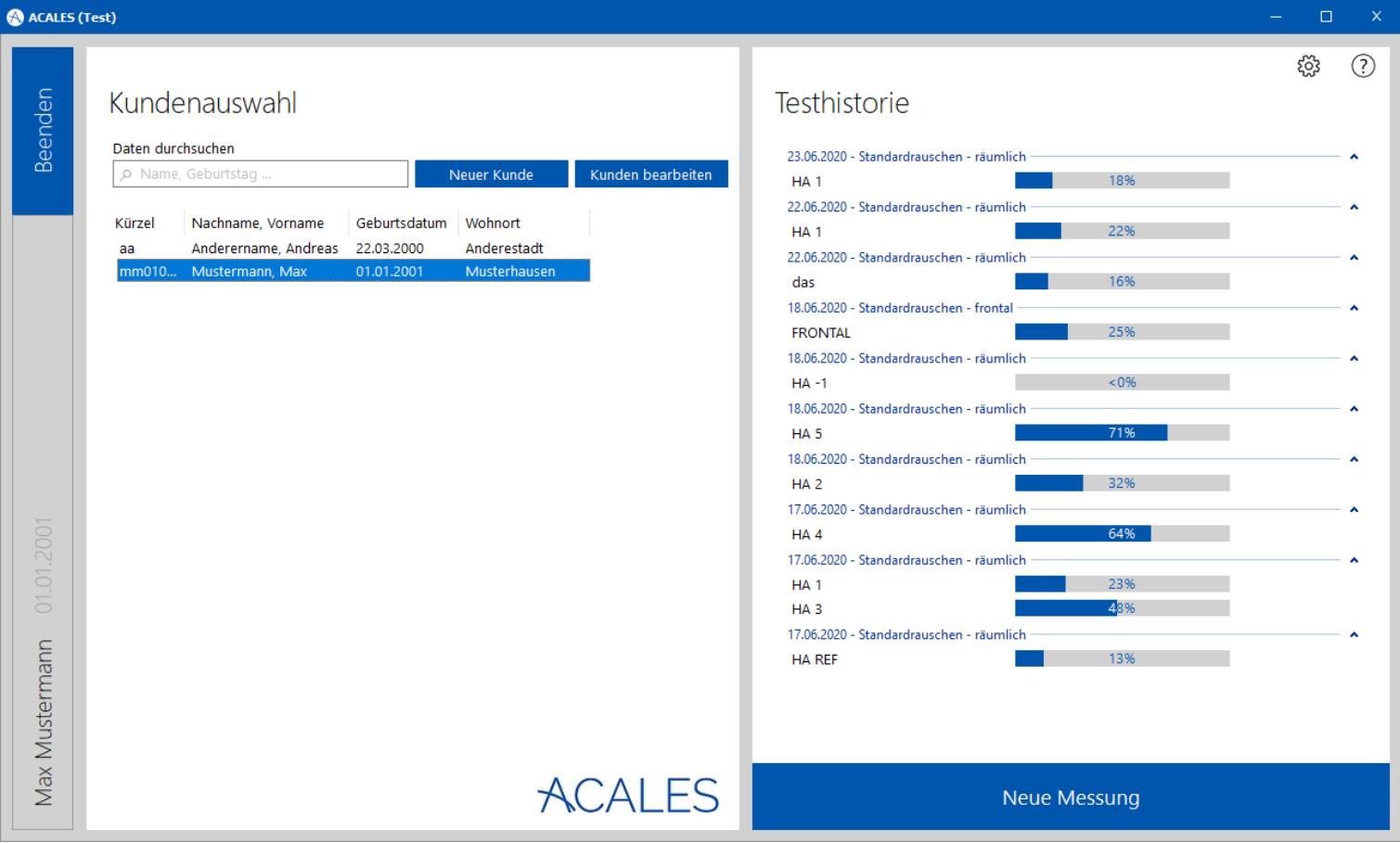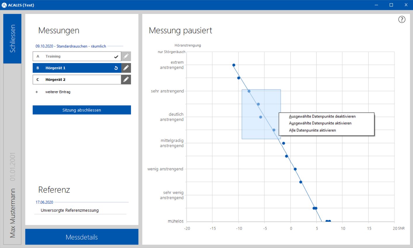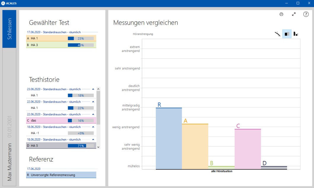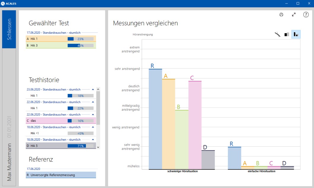 Die Ergebnisse werden durch Diagrammen übersichtlich auf dem Bildschirm dargestellt, so dass Ihre Kundschaft den Nutzen der Hörsysteme auf den ersten Blick nachvollziehen kann. Die Ergebnisdarstellung kann sogar kundenspezifisch angepasst werden. Das alles bietet ACALES für nur 19,99 € monatlich pro Arbeitsplatz.