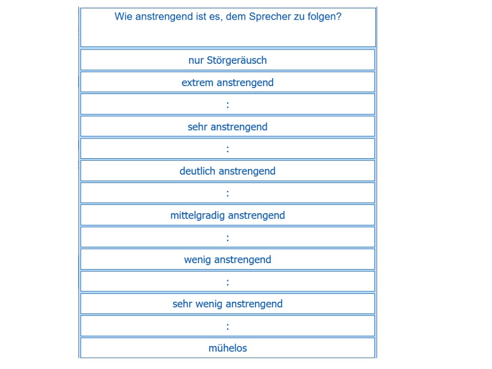 ACALES ist ein Sprachtest mit Störgeräusch, bei dem Ihre Kundinnen und Kunden die Höranstrengung auf einer Skala von „mühelos“ bis „extrem anstrengend“ bewerten. Auch die Bewertung „nur Störgeräusch“ ist möglich, wenn gar keine Sprache mehr wahrnehmbar ist.