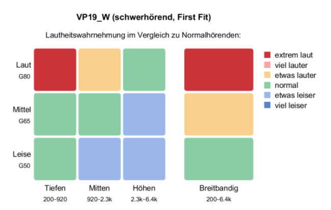 At the end of the measurement, the result is presented in the form of a loudness map, which describes the loudness perception in the 12 categories in comparison to people with normal hearing by using different colors. The loudness map shows the results with colored fields for the frequency ranges low (200-920 Hz), mid (920-2,300 Hz), high (2.3-6.4 kHz) and for broadband signals for the levels 50 dB (quiet), 65 dB (medium) and 80 dB (loud).